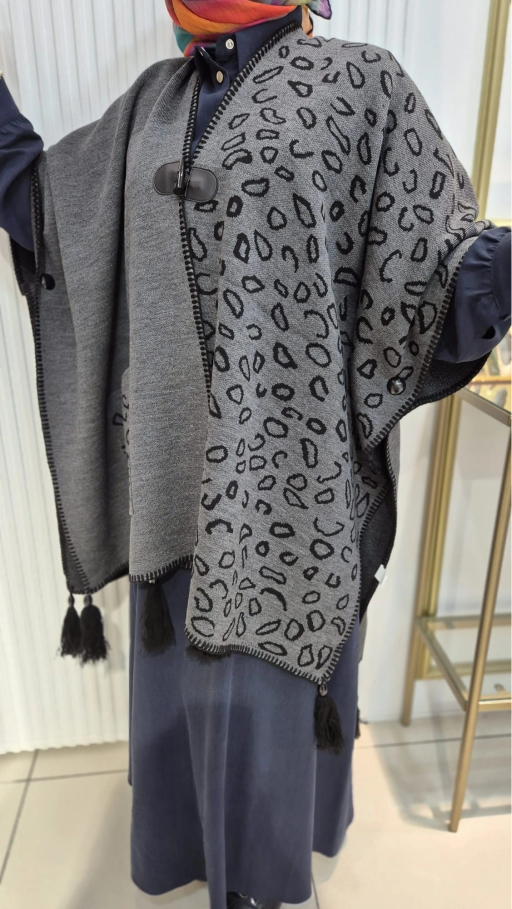 Bu Leopar Desenli Püsküllü Triko Panço, gardırobunuza eşsiz bir hava katacak. Hem şık hem de rahat olan bu panço, kombinlerinize farklı bir dokunuş sağlayacak.