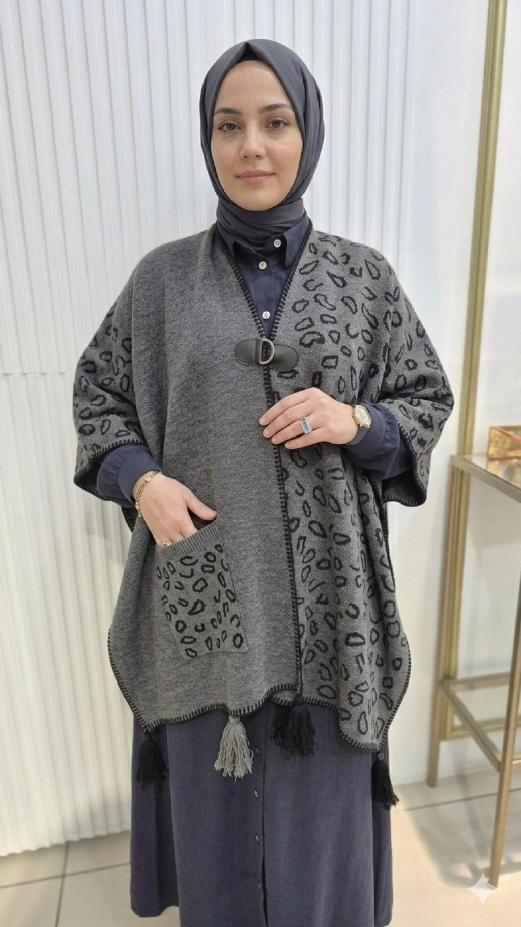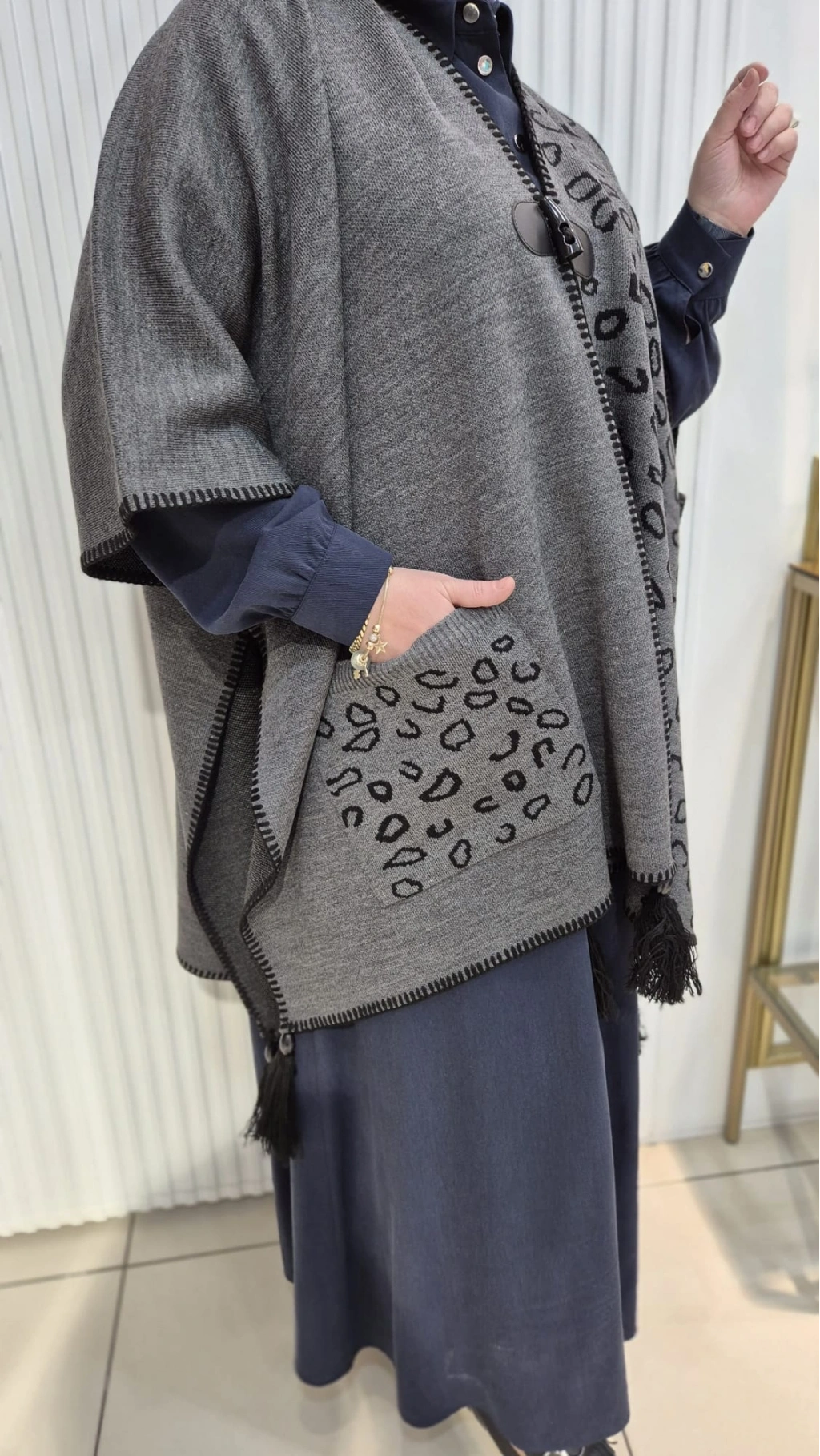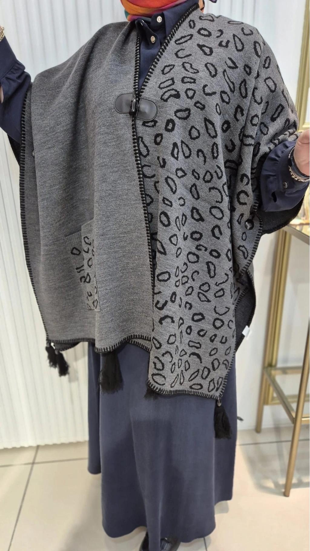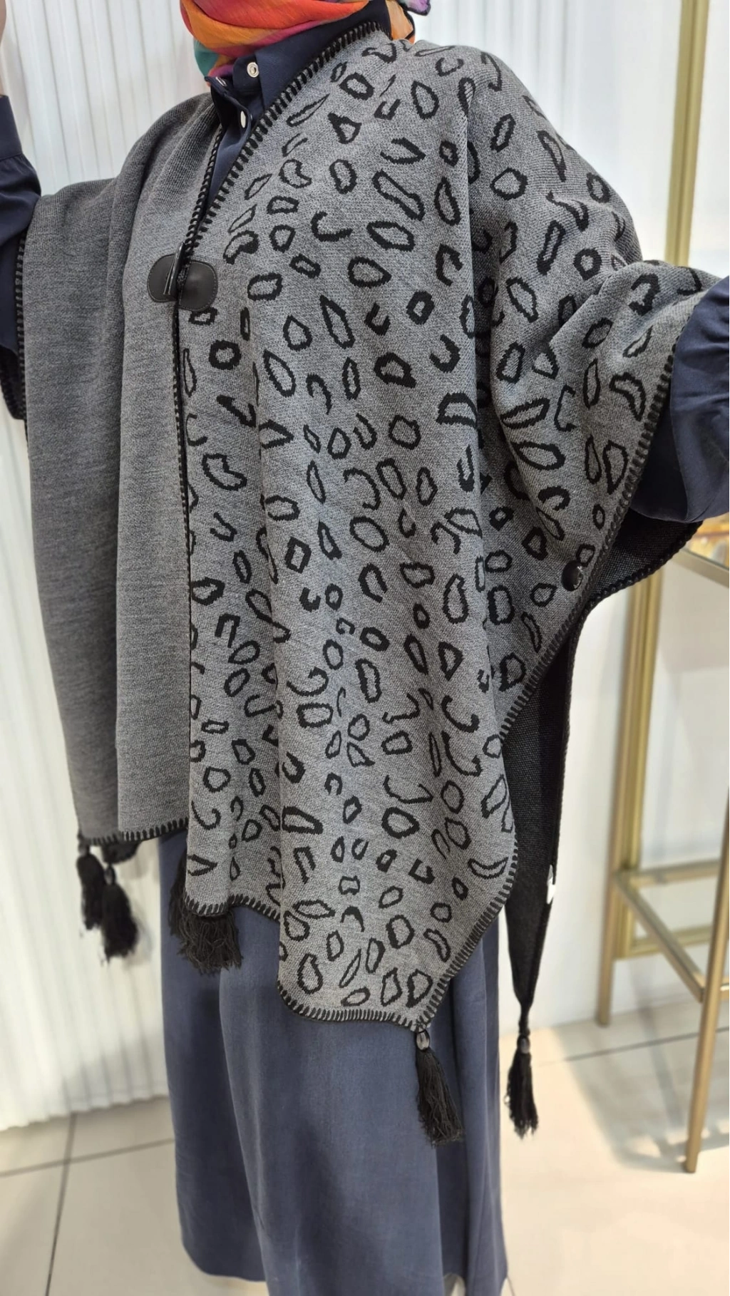 LEOPAR DESEN Püskül Detaylı GRİ Triko Panço