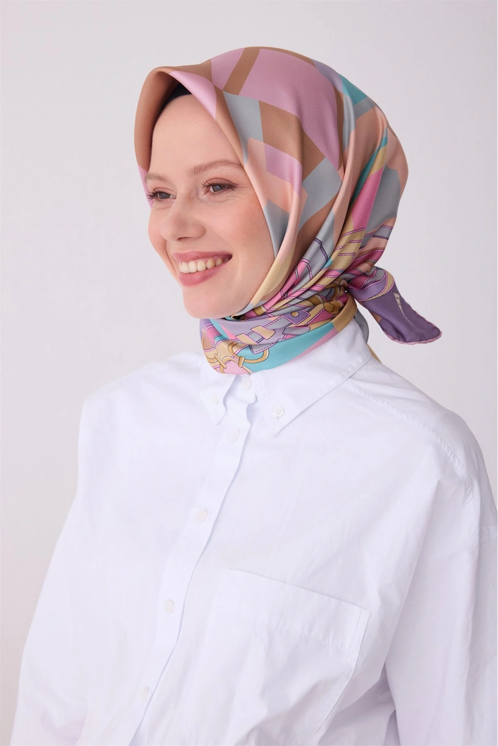 Mercan Çok Renkli Geometrik Desen %100 Twill İpek Eşarp